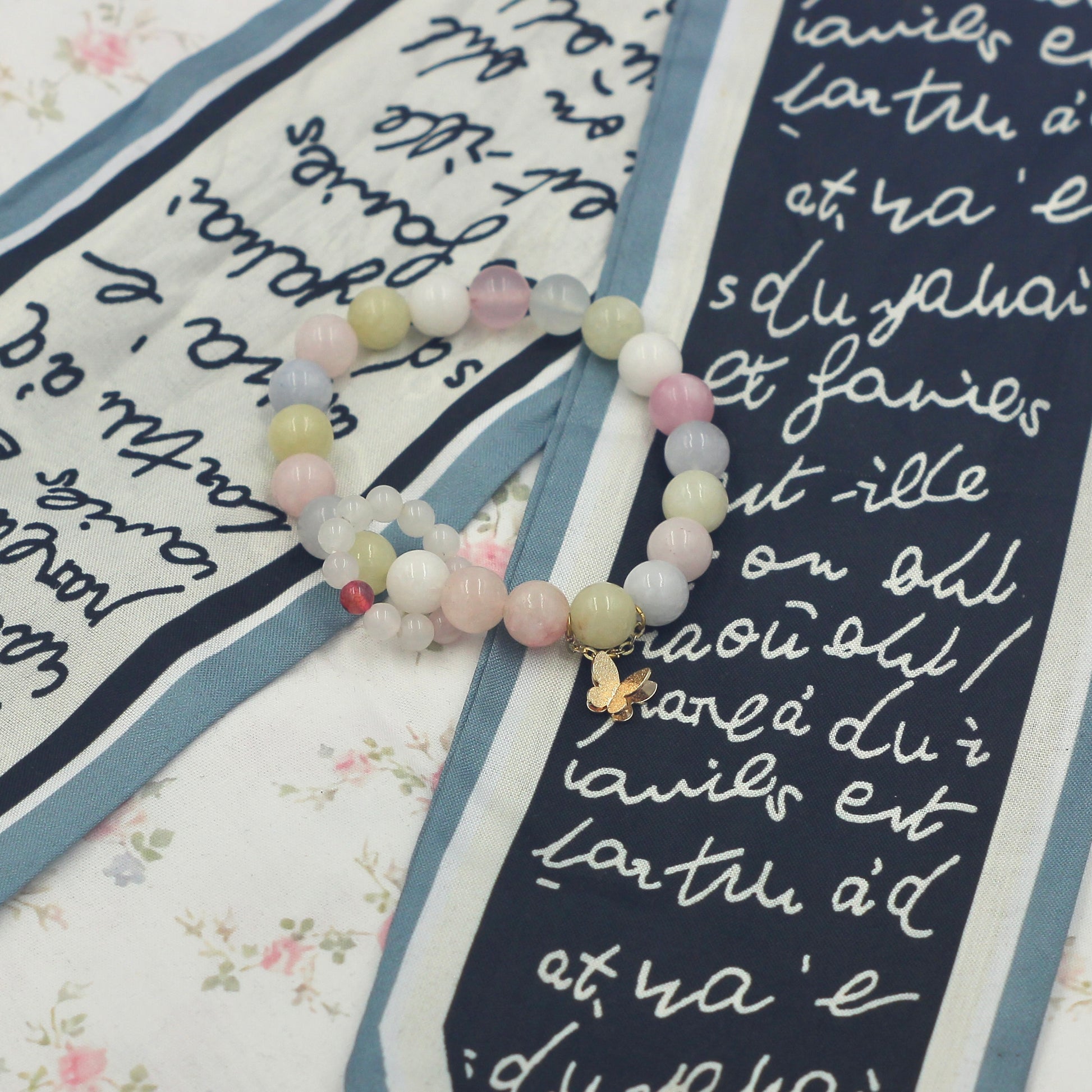 This multi-colored Morganite bracelet radiates softness and joy with its delicate blend of pastel natural stones — blush pink, creamy yellow, light green, lavender, and milky white. Each 8mm gemstone bead is unique, creating a beautifully balanced and feminine look.