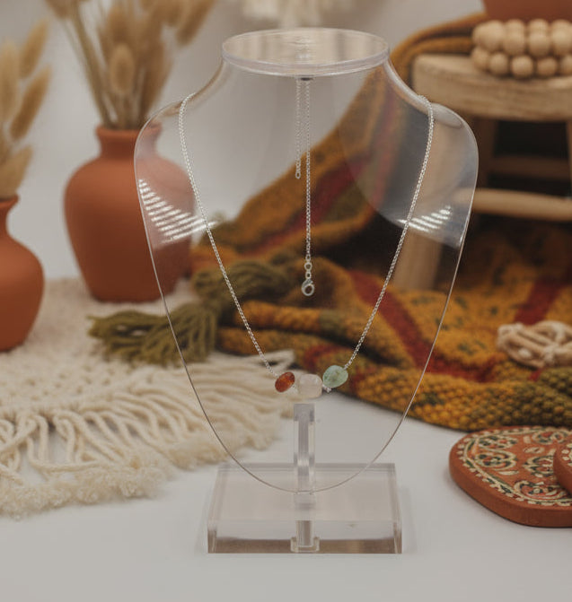 This elegant minimalist necklace features three natural raw agate stones in different shapes and colors, each uniquely beautiful. The stones are set on a delicate 925 sterling silver chain, creating a simple yet sophisticated look perfect for both daily wear and special occasions.